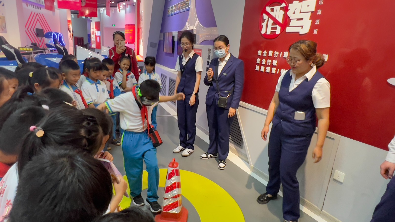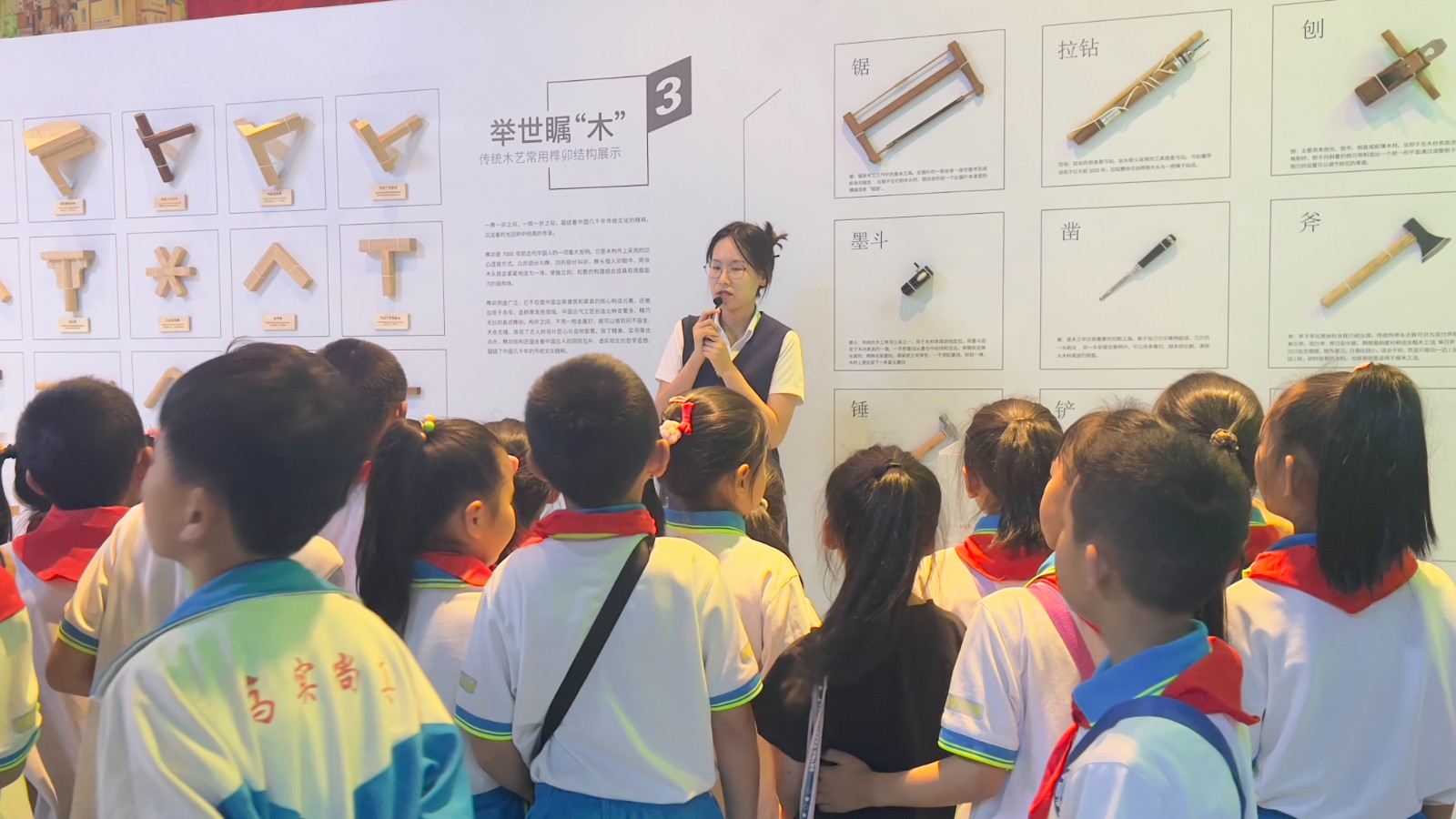在科技馆工作人员的带领下,同学们有序地进行参观。参观过程中,同学们一边认真听讲解,一边动手体验,他们时而激烈讨论其科学原理,时而认真揣摩展品构造,从“榫卯结构展示”“模拟地震体验”“醉酒体验”到“解密蛟龙号”,孩子们的眼神中充满了好奇,为自己能够亲自体验科学现象,探索展品包含的科学原理兴奋不已。